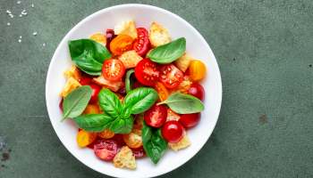 A simple tomato and basil salad, dressed with olive oil to provide healthy fats and antioxidants.